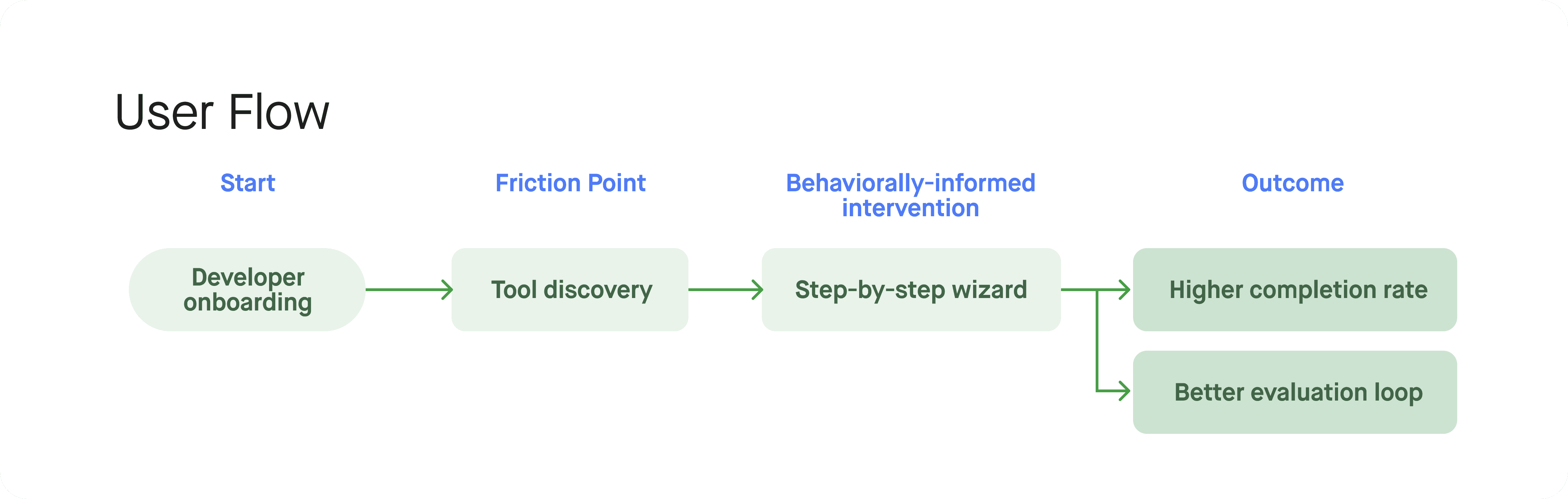 • Flow maps illustrating simplified developer onboarding, evaluation journeys, and safe experimentation loops.